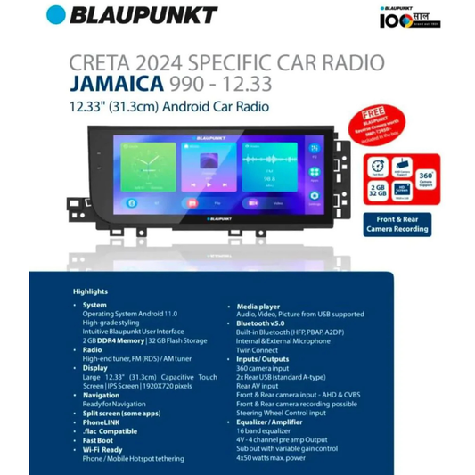 Blaupunkt Jamaica 990 Android System – 12.3″ / 33cm for Hyundai Creta (2024 Onwards) | 2GB RAM + 32GB ROM | Smart Infotainment Upgrade