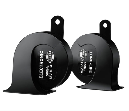 Hella Pearl Trumpet Horn Set (12V, 400/500 Hz, 105-118 dB @ 2m) | For Bikes and Cars