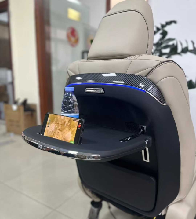 The foldable tray table allows passengers to enjoy meals, work on a laptop, or place drinks and gadgets comfortably during travel. With integrated ambient lighting and wireless charging support, it enhances both convenience and interior aesthetics, making long journeys more comfortable and organized.